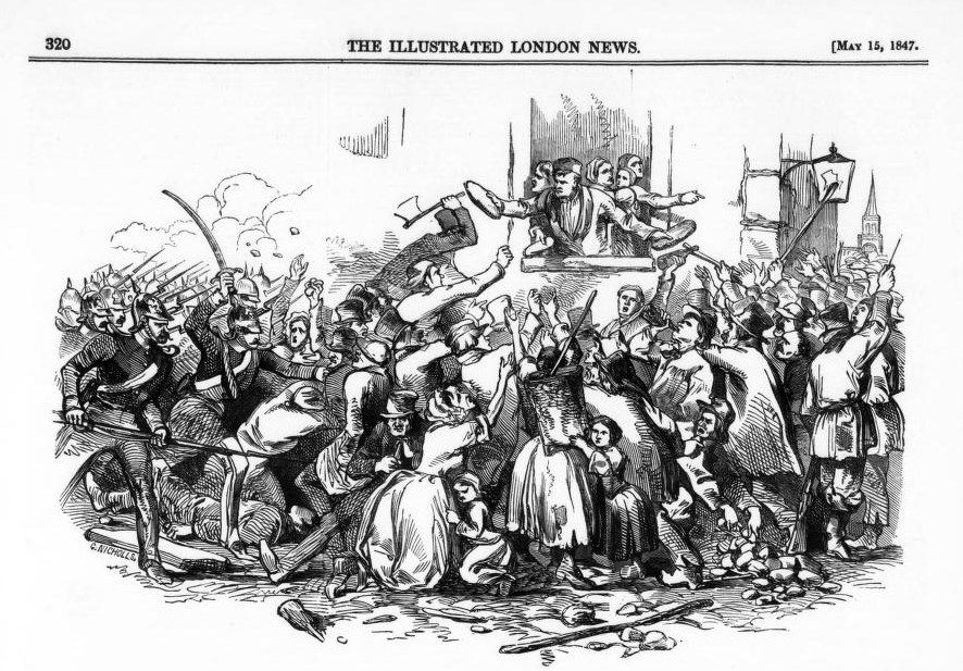 Am 24. April 1847 hätte ein „Mob der Unterschicht“ , vorwiegend aus Frauen und Kindern bestehend, die Kartoffelhändler im Hafen angegriffen und wäre dann weitergezogen um die Bäcker auszurauben. All das geschah am Tag der Messe, so dass auch viele Händler zu Schaden kamen. Es kam schlussendlich zu Feuergefechten mit dem Militär, mehrere Menschen wurden verwundet, zwei starben. Solche Aufstände wäre inzwischen in Deutschland sehr verbreitet.