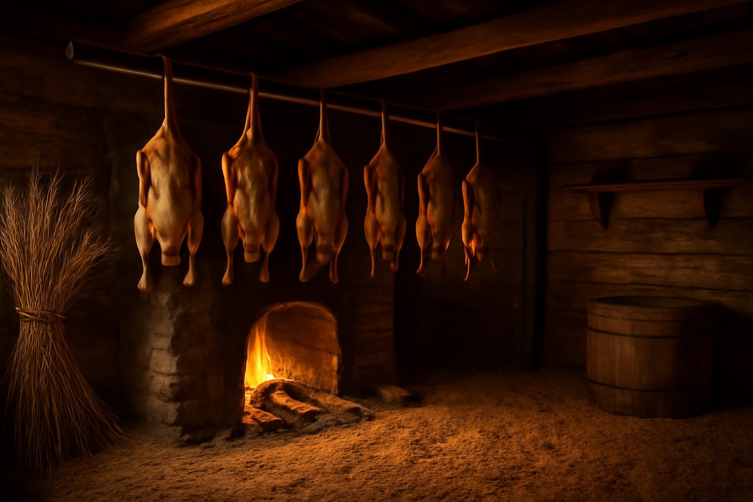 Anschließend werden die Gänse auf ihre Holzspieße gesteckt, so dass sie sich nicht berühren, sondern jeweils ein Fingerbreit Abstand haben. Dann hängen sie höchstens acht Tage lang in einem Rauchraum, in dem keine offene Hitze herrscht, nur der Rauch. Nach diesen acht Tagen werden die Gänse herausgenommen und an einem Balken acht Tage lang zum Trocknen aufgehängt. Danach reinigt man sie mit einem Leinentuch von der Kleie.