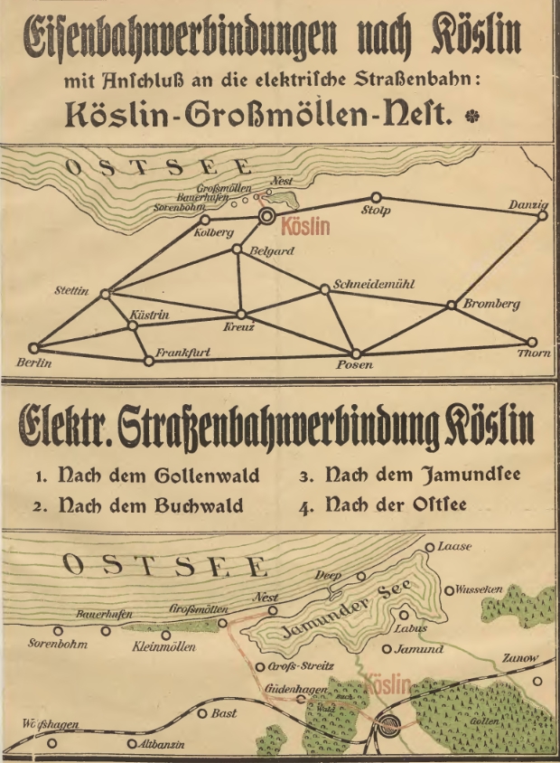 Die wachsende Bedeutung der pommerschen Ostseebäder hing von der Verkehrsanbindung ab. Köslin/Koszalin bot schon ab 1913 eine elektrische Straßenbahn zu den Badeorten Groß Möllen/Mielno und Nest/Unieście. https://de.wikipedia.org/wiki/K%C3%B6sliner_Stadt-_und_Strandbahn