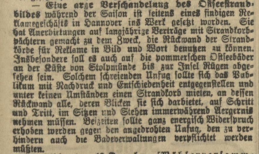 Nochmal Thema Strandkorb. Das Stralsunder Tageblatt vom 16.12.1911 ereifert sich: „Eine arge Verschandlung des Ostseestrandbildes “ würde durch Werbung an der Rückseite des Strandkorbes entstehen. Diese Art der Werbung wurde m.W. damals nie Wirklichkeit im Gegensatz zu heute.